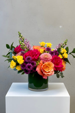 The palette is bold and playful, yet artfully balanced, perfect for birthdays, anniversaries, thank-yous, or “just because” moments that deserve something unforgettable. Its loose, modern styling and energetic color mix create the floral equivalent of a celebration you can hold in your hands.