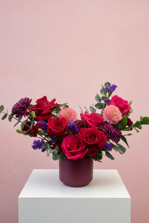 Turn up the color this Valentine’s Day with Valentine Color Crush, a vibrant mix of romantic reds, bold pinks, and rich purples designed to make a statement. This joyful bouquet features purple cremones, purple statice, hot pink roses, pink germinis, red roses, and red pixie carnations, creating a lush, energetic arrangement that feels fun, modern, and full of personality.