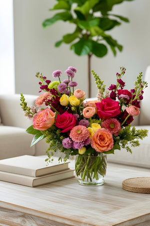 Bloomfettiis a joyful, confetti‑inspired burst of color designed to feel like a celebration in bloom. With playful pops of pink, coral, yellow, and seasonal accents, this arrangement brings instant happiness and a light, festive energy. Featuring roses, hydrangea, button mums, stock, germondos, spray roses and premium and luxe options with ranunculus and snapdragons, it’s the perfect choice for birthdays, congratulations, thank‑yous, or brightening someone’s day “just because.” Handcrafted in our signature modern, garden‑style aesthetic and available for same‑day delivery in Castle Pines, Castle Rock, Lone Tree, and Parker when ordered before 10 AM.
