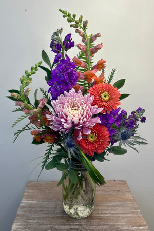 Each bouquet is completely custom and created with the freshest seasonal flowers of the day. Because we design these using what’s blooming best right now, your arrangement will not look exactly like the photo — and that’s part of its charm. Every Mason Jar Bouquet is one‑of‑a‑kind, thoughtfully arranged in a classic glass jar with a mix of colors, textures, and blooms chosen by your florist.