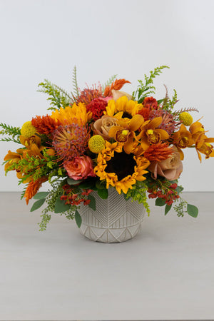 Bouquet designed with a seasonal selection of our premium flower blooms and foliages in all the shades of the season like golden yellows, oranges, corals, burgundys, reds, coppers and rust. Customers choose this bouquet for :