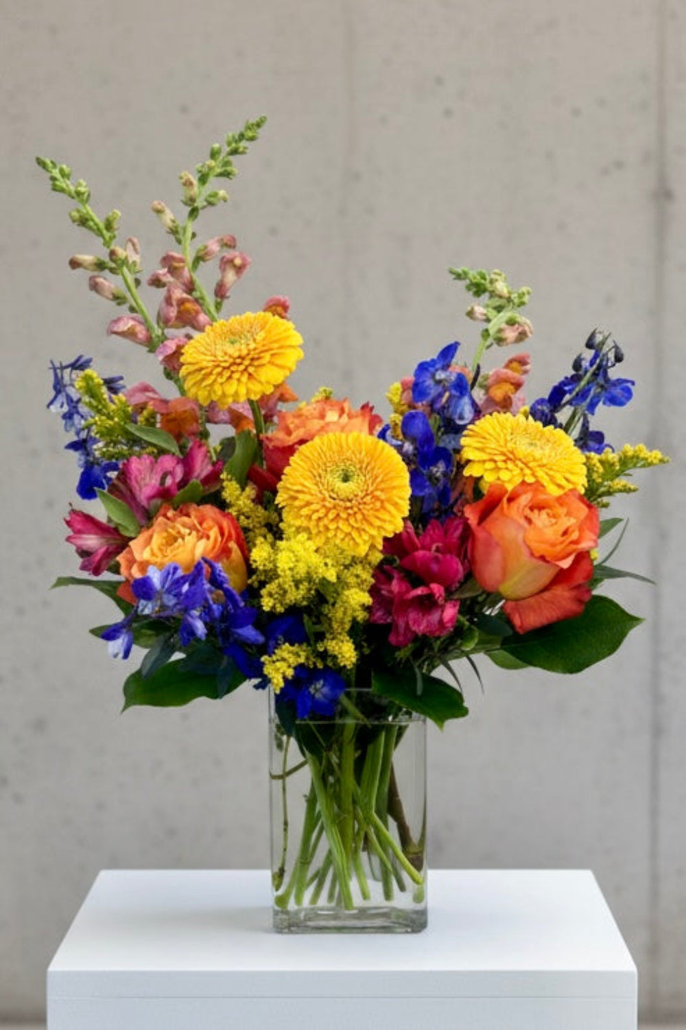 Turn any moment into a celebration with Happy Hour Fiesta, a bright and joyful mixed flower bouquet designed to bring instant cheer. Bursting with flowers like vibrant blue delphinium, sunny yellow germinis, bold orange roses, hot pink alstroemeria, apricot snapdragons, and fresh yellow fillers, this arrangement delivers pure color happiness in a modern glass vase.