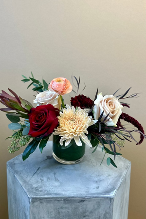 Rosé Ember is a hand-designed arrangement featuring burgundy safari sunset, blush and wine roses, ranunculus, cremones, pixie carnations, deep red and soft green foliage — all styled in a sculptural, modern bouquet with plenty of breathing room.